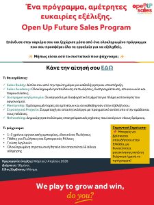 Το Open Up Future Sales Program, αποτελεί ένα δυναμικό πρόγραμμα 18μηνών, που προσφέρει μια πολυεπίπεδη και εμπλουτισμένη εμπειρία στο τμήμα Πωλήσεων, υπερβαίνοντας τις συνηθισμένες προσδοκίες ενός graduate trainee. Οι συμμετέχοντες έχουν την ευκαιρία να αποκτήσουν πρακτική και ουσιαστική εμπειρία της αγοράς αναπτύσσοντας σφαιρική αντίληψη του εμπορικού τοπίου.